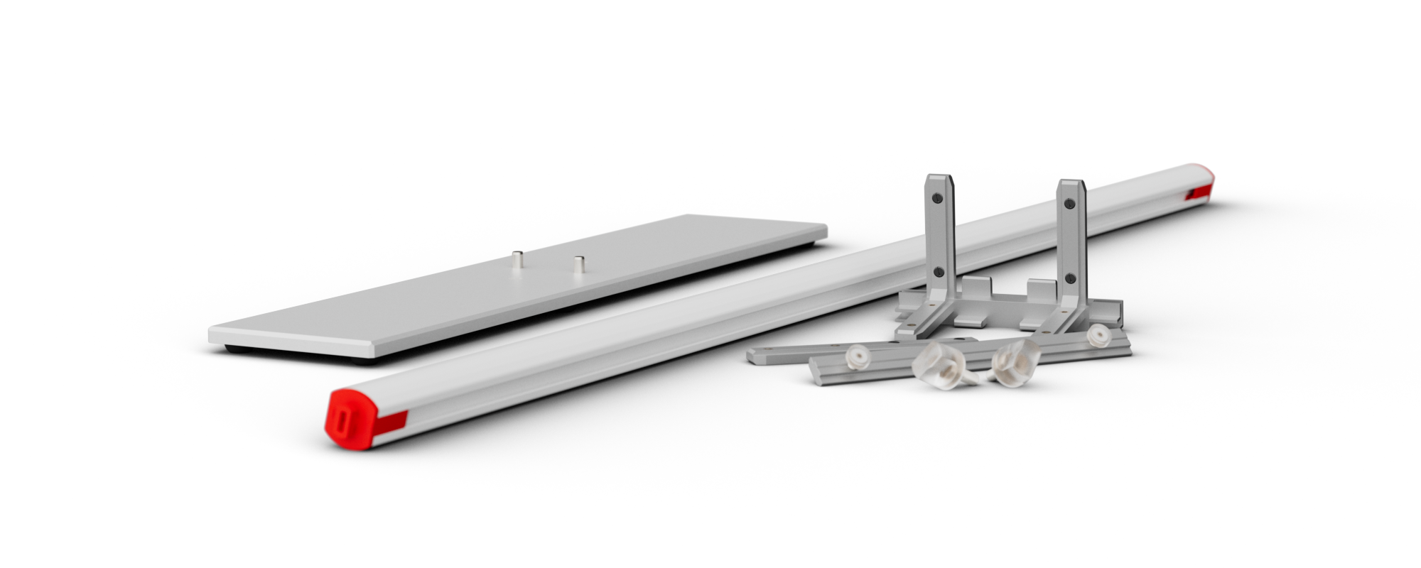 Nehmen Sie die einzelnen Bauteile einfach aus dem praktischen ABS-Koffer, setzen Sie sie zusammen (kein Werkzeug erforderlich), schrauben Sie die Füße an – und schon ist das System einsatzbereit! Die Drucke mit angenähten Silikonkedern lassen sich mühelos am System befestigen, sind benutzerfreundlich in der Handhabung und können jederzeit rasch und einfach ausgetauscht werden.