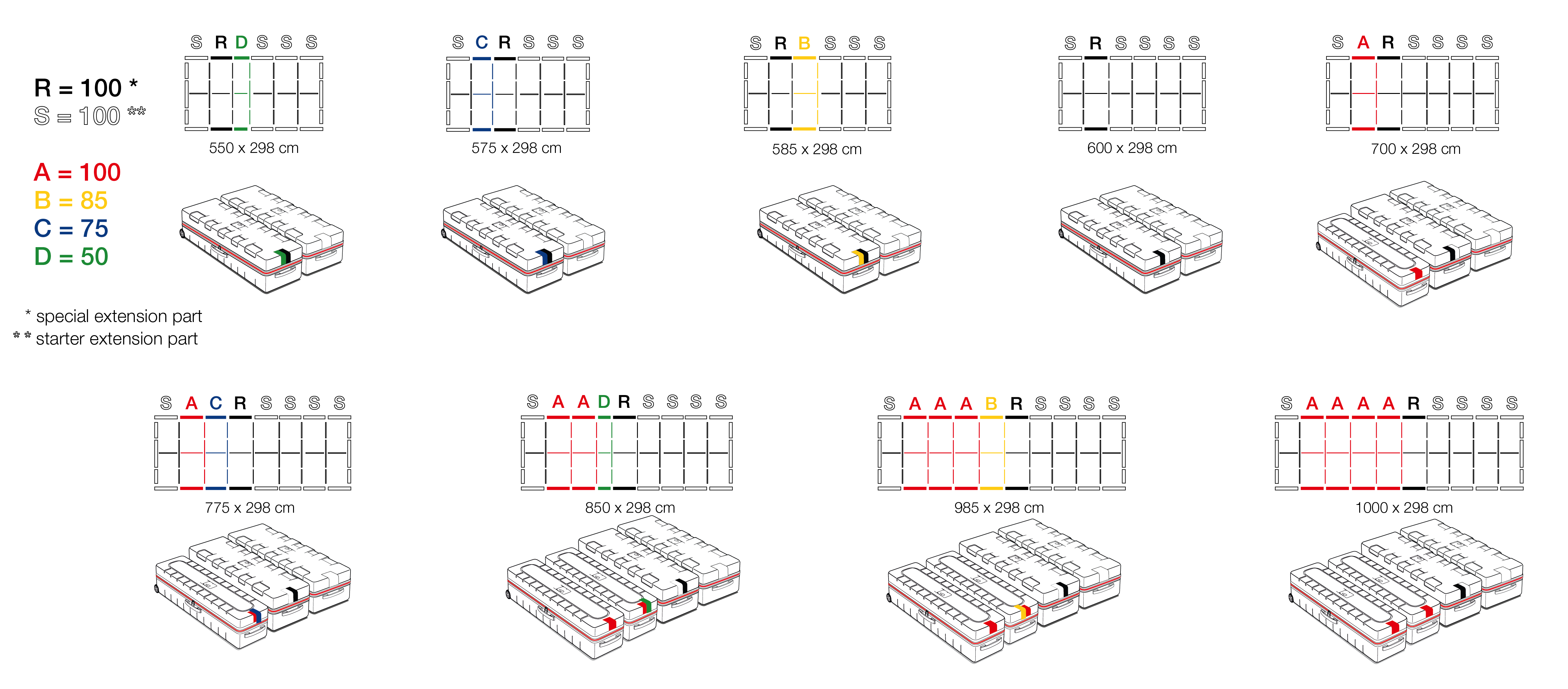 Entdecken Sie die modulare Flexibilität des REAL BIG LEDUP®, der sich an jede Fläche anpassen lässt. Erweitern Sie Ihr System auf eine maximale Breite von 1000 cm mit 50, 75 oder 100 cm breiten Erweiterungsmodulen. Wählen Sie aus verschiedenen Höhen von 200, 230, 248 oder 298 cm. Verbinden Sie die Erweiterungsmodule einfach zwischen zwei Startermodulen und profitieren Sie von einem werkzeuglosen Aufbau für Ihre individuelle Lösung!