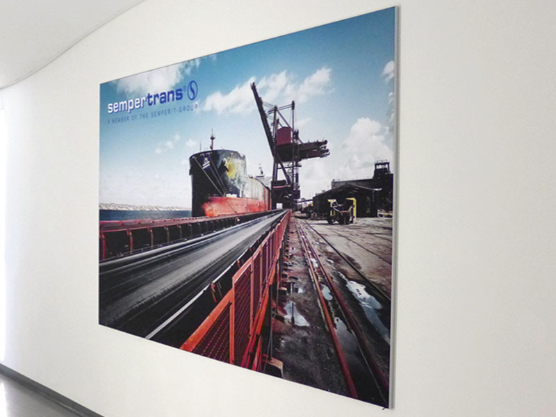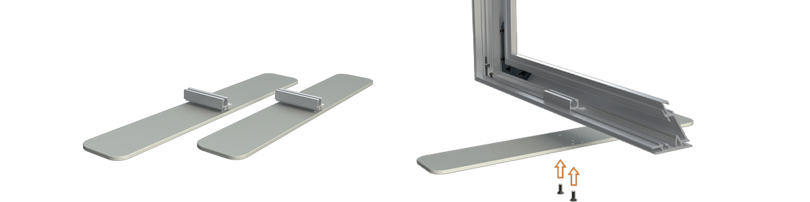 Mit zwei oder mehr Stellfüßen können Rahmen mit mf-65 Profilen auch freistehend aufgestellt werden. Wahlweise kann der Systemrahmen beidseitig oder einseitig mit Stoffgrafiken bespannt werden.