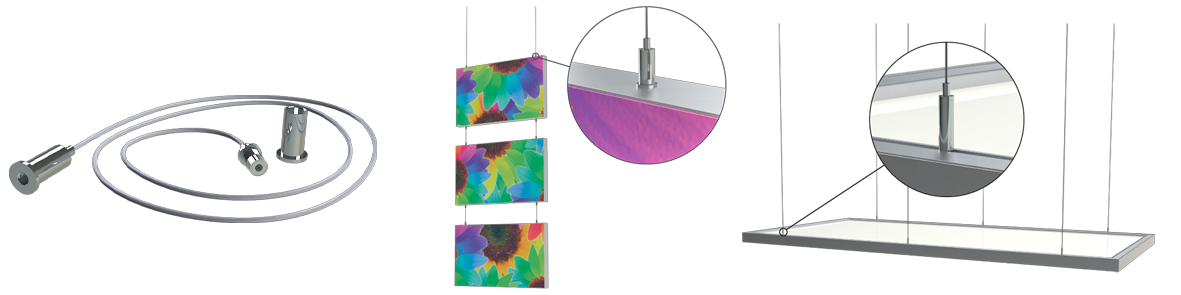 Die Spannrahmen mit Profilstärke 18 mm bzw. 65 mm können mittels Stahlseilen abgehängt werden. Der Rahmen muss an den Verankerungsstellen seitlich angebohrt werden. Die Stahlseile werden je nach Bedarf zugeschnitten geliefert.