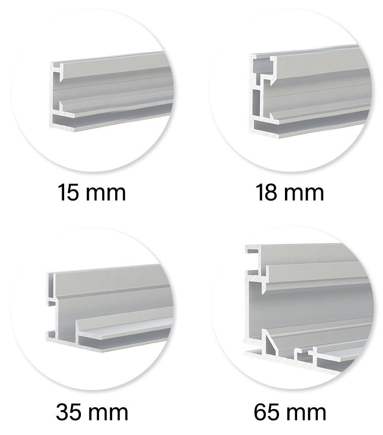 Vier unterschiedliche Profiltiefen werden verwendet, um verschiedene Rahmengrößen zu erstellen – erhältlich in 15, 18, 35 mm und 65 mm.