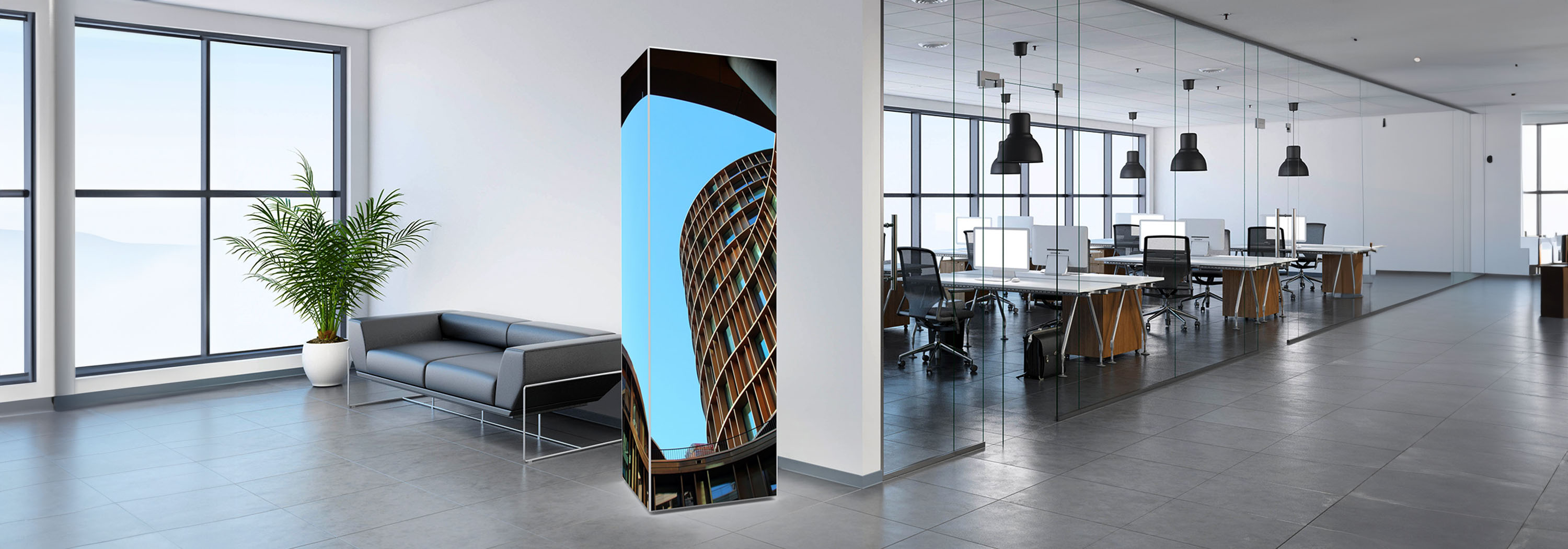 Die Multi Tower Profile aus silber eloxiertem Aluminium sind leicht mit LED-Lampen hinterleuchtet und einfach zu transportieren.