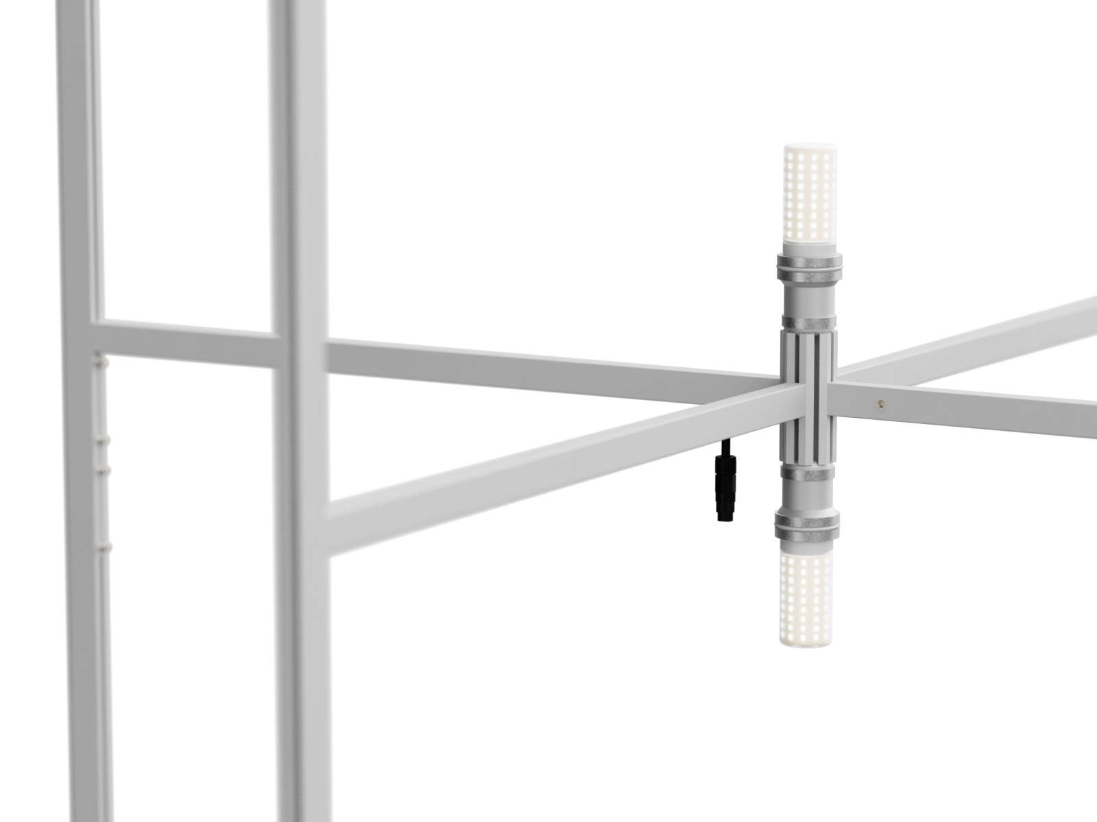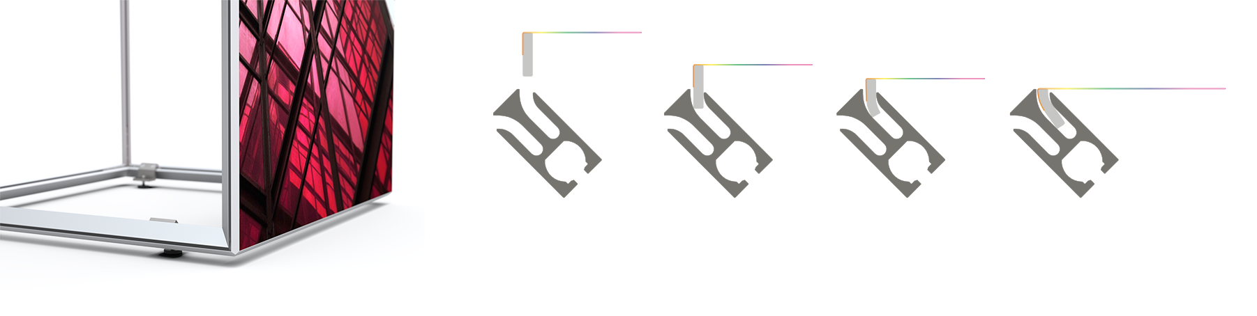 Die Verbindungen an den geraden Profilen sind mit einem Aluminiumkreuz verstärkt, das auch als Lampenhalterung für LED-Lampen angepasst werden kann. Diese Technik ermöglicht eine gleichmäßige Ausleuchtung ohne Schattenbildung.
