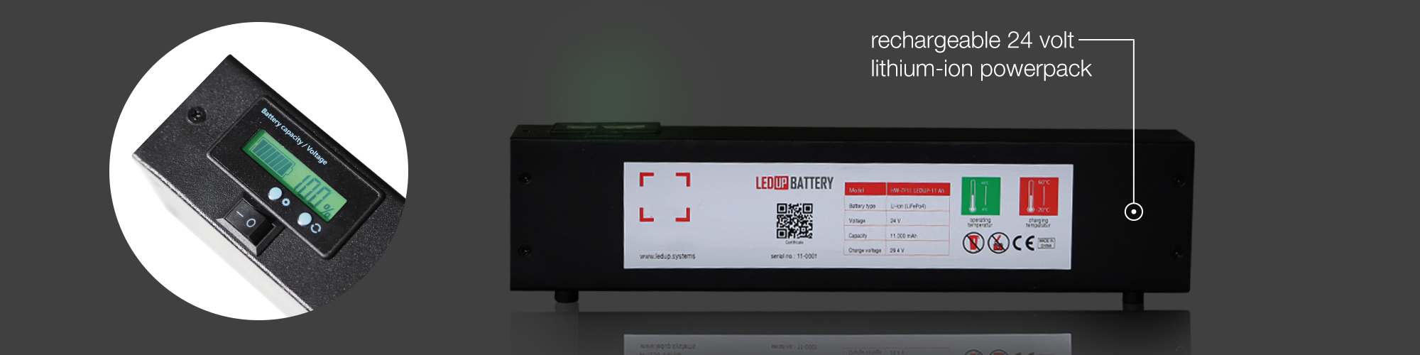 The rechargeable 24 volt lithium-ion battery has a weight of 2.8 kg with an output of 11,000mAh and can illuminate the Counter for approximately 9 hours. This gives you the opportunity to illuminate the Counter MAX, Counter ONE and LEDUP Counter for an entire day at a fair.