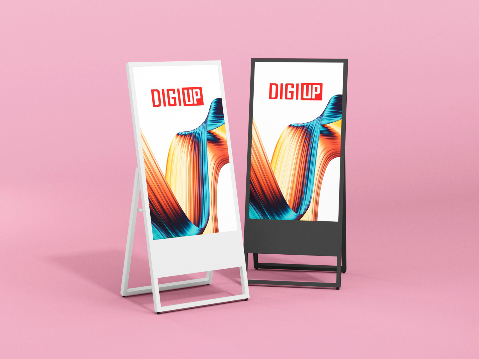 The DIGIUP STAND is a versatile customer stopper that can be used in various environments. In shop windows, it serves as a striking advertising space to attract passersby and promote products. In retail stores, it highlights special offers and new products to boost sales. In restaurants, the DIGIUP STAND can be used as a digital menu to display daily changing dishes or promotions. At events and trade shows, the customer stopper modernly conveys information about products and services. With its sleek, patented metal housing, it is lightweight yet stable, making it portable and versatile.