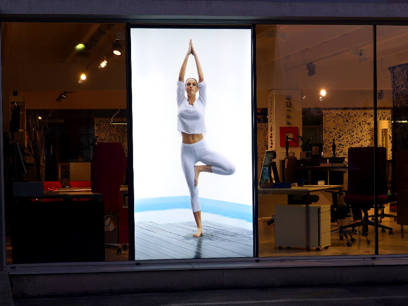 Multi frame backload LED light boxes can be used single or double sided. For stability reasons backload is often used with large formats. The special design of the profile allows that you can change graphics from one side. You open the back side/take off the print and then you are able to take out the front print/picture from behind.