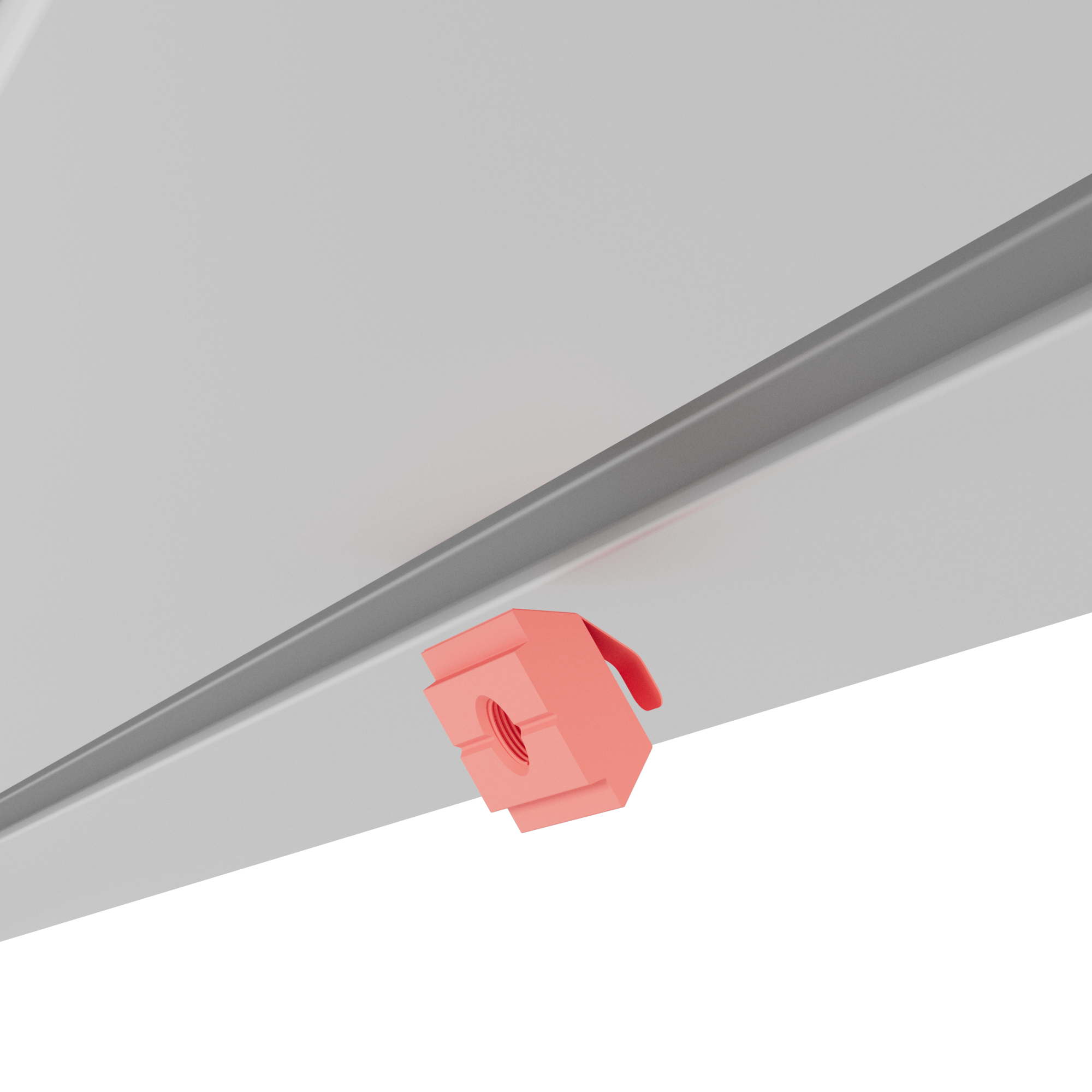 Like all LINEUP components, the Product Hanger is designed for quick and effortless installation. It is mounted directly into the LINEUP frame profiles using the integrated M5 thread and groove section — completely tool-free. This allows for fast setup, secure suspension, and flexible positioning within the display system.